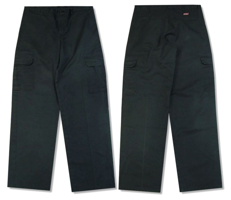 ディッキーズ カーゴパンツです。カラーはブラックで素材はポリエステル65% コットン35%になります。着用感はありますが、特に目立ったダメージはありません。