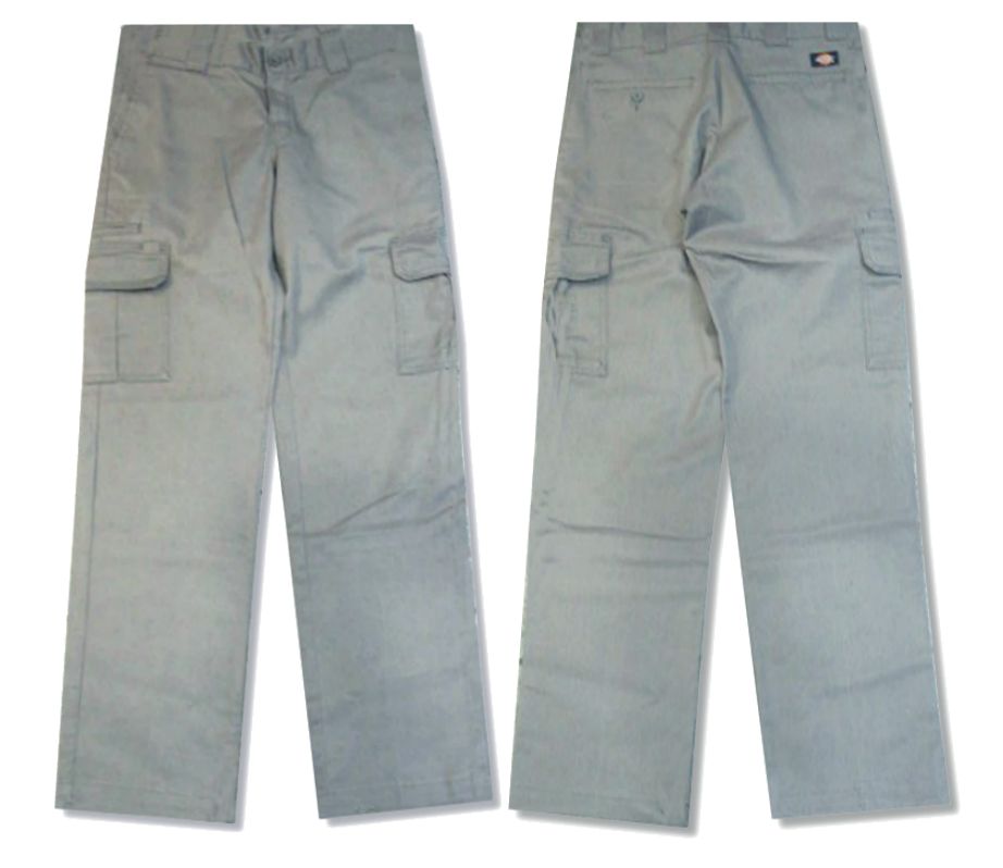 ディッキーズ カーゴパンツです。カラーはグレーで素材はポリエステル65% コットン35%になります。着用感はありますが、特に目立ったダメージはありません。