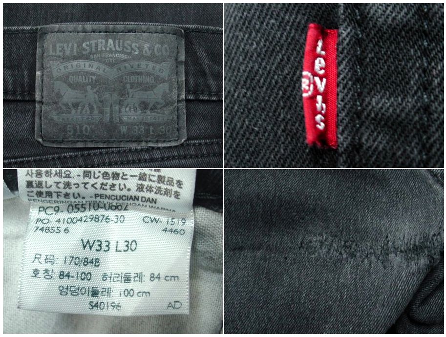 Levi's 510 ブラック スリムジーンズです。股下にリペアがありますが、特に目立ったダメージはありません。
