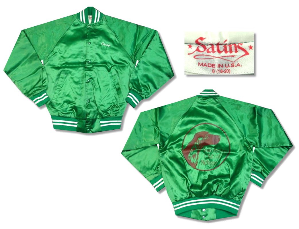 1990年代製 Satins ナイロンスタジャンです。MADE IN USA カラーはグリーンで素材はナイロン100%になります。着用感はありますが、特に目立ったダメージはありません。
