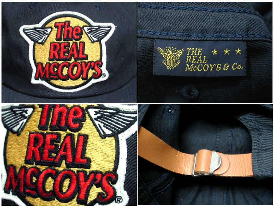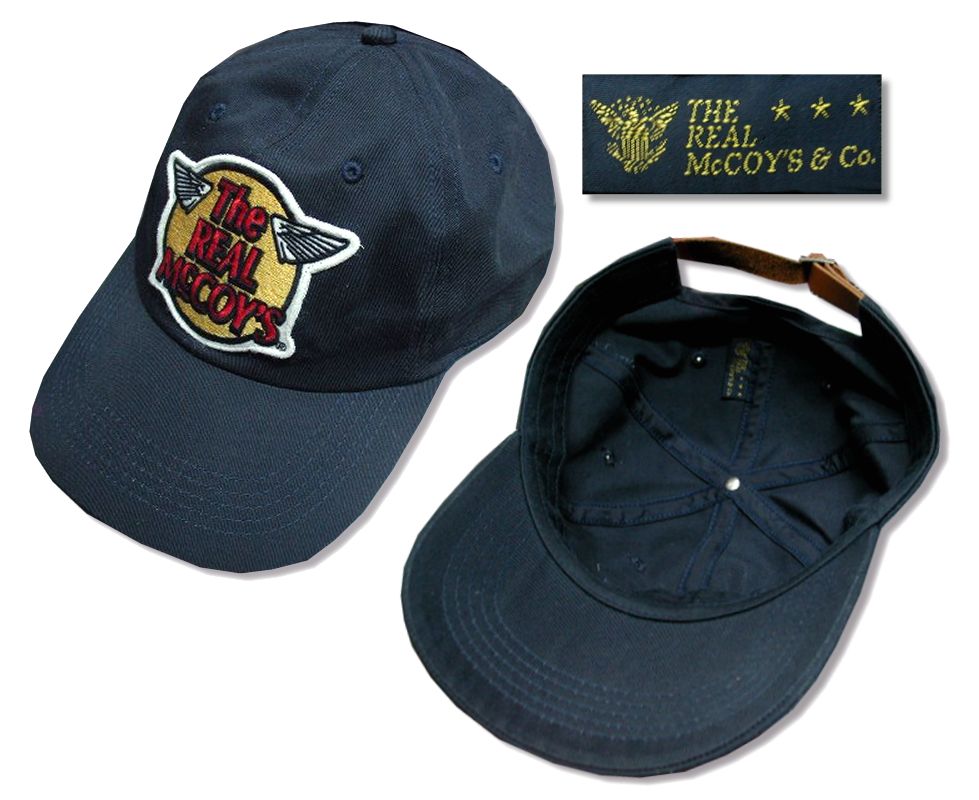 リアルマッコイズ ロゴ ベースボールキャップです。MADE IN JAPAN ロゴパッチが縫い付けられたキャップです。サイズはレザーアジャスター調整仕様。カラーはネイビーになります。状態は良好で特に目立ったダメージはありません。