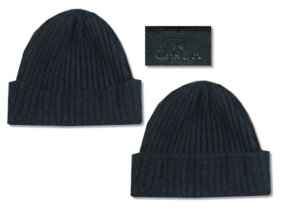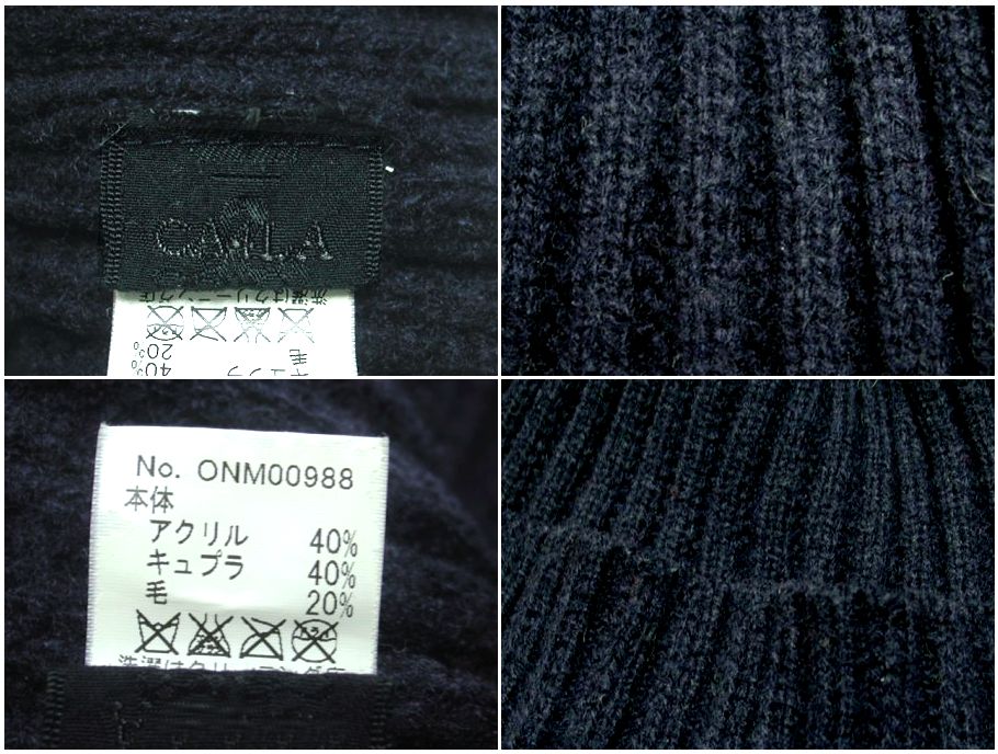 CA4LA ニットキャップです。カラーはネイビーで素材はアクリル40% キュプラ40% ウール20%になります。着用感はありますが、特に目立ったダメージはありません。
