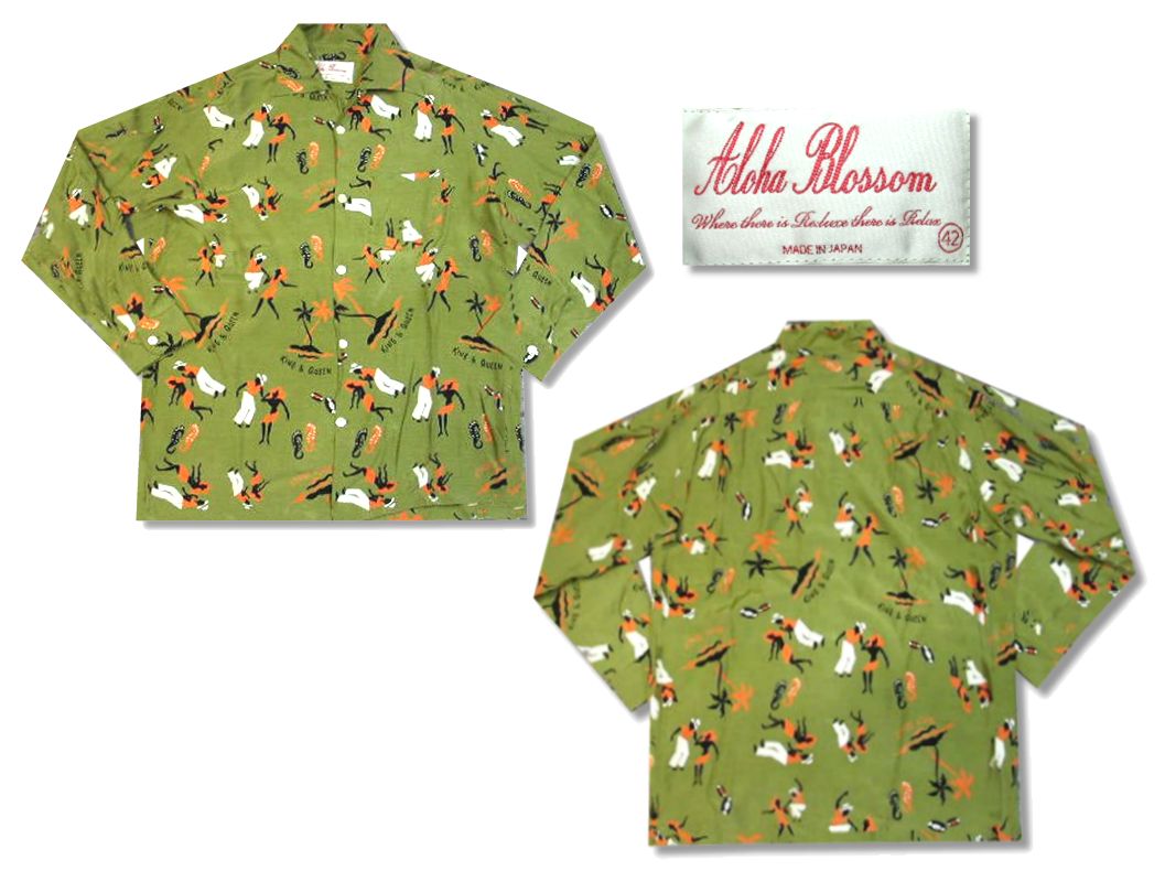 アロハブロッサム キング&クイーン 長袖アロハシャツです。MADE IN JAPAN 素材はレーヨン100% 着用感はありますが、特に目立ったダメージはありません。