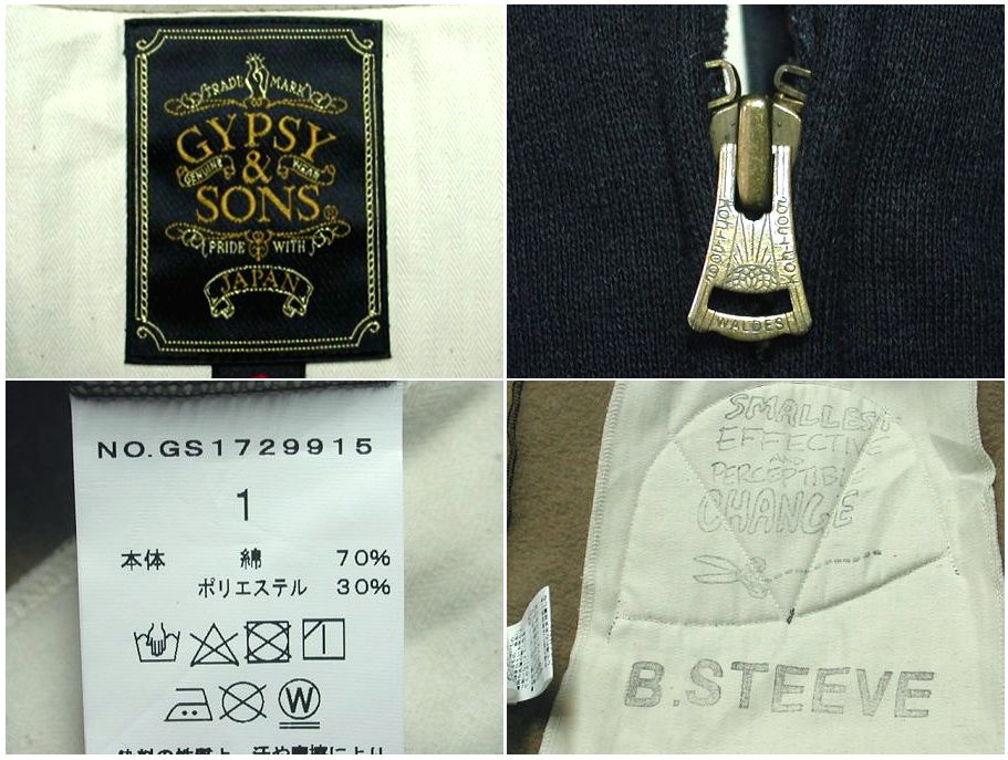 ジプシー&サンズ ジップアップ スウェットジャケットです。MADE IN JAPAN カラーはブラックで素材はコットン70% ポリエステル30%になります。着用感はありますが、特に目立ったダメージはありません。