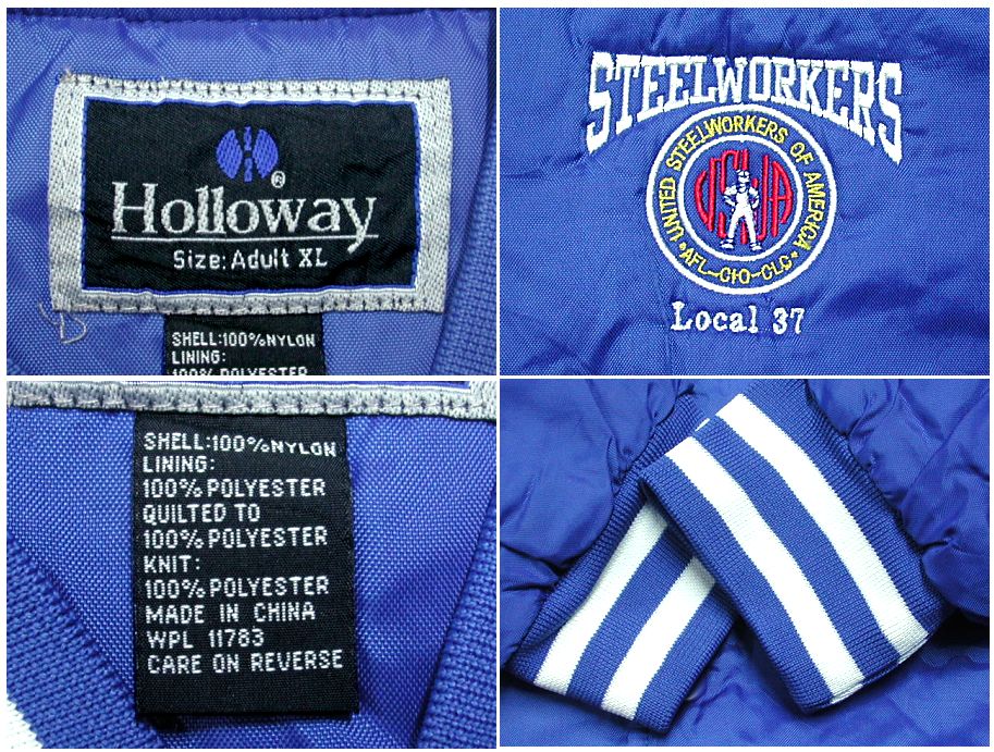 Hplloway 中綿入り ナイロン スタジャンです。カラーはブルーで素材はナイロン100%になります。着用感はありますが、特に目立ったダメージはありません。