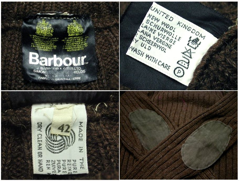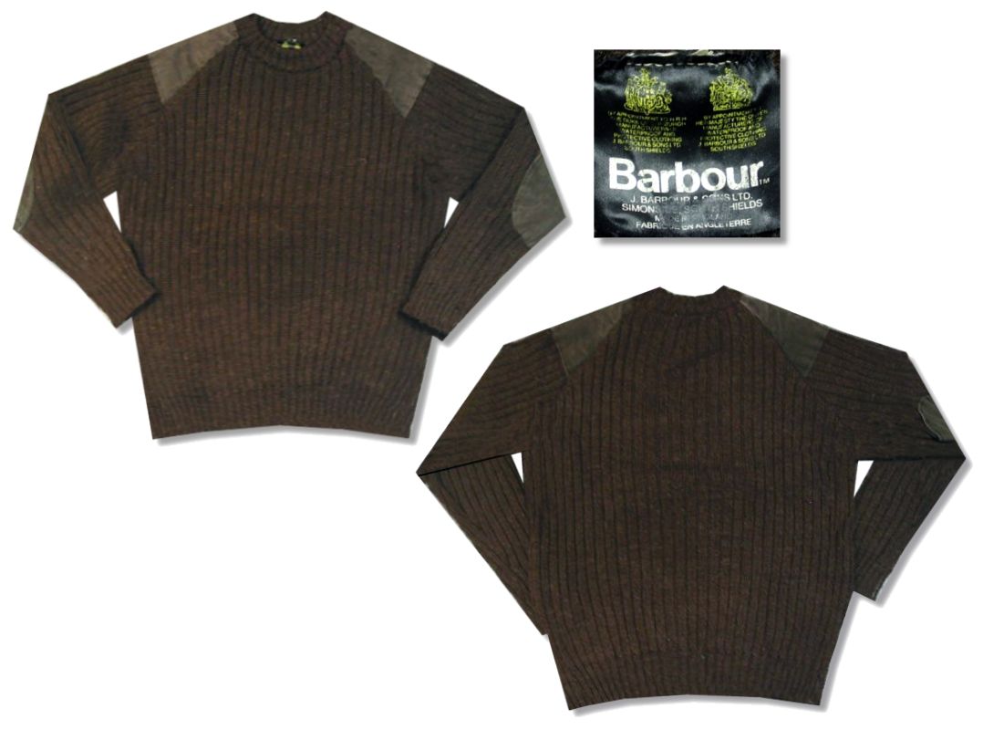 バブアー セーターです。MADE IN ENGLAND カラーはブラウンで素材はウール100%になります。肩とエルボーパッチはスエードです。着用感はありますが、特に目立ったダメージはありません。