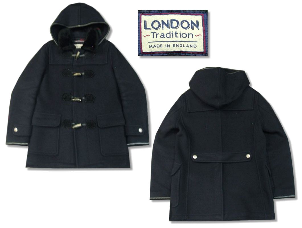 ロンドン トラディション ダッフルコートです。MADE IN ENGLAND カラーは濃紺で素材はウール100%になります。袖口はレザー仕様になります。フードは着脱可能です。着用感はありますが、特に目立ったダメージはありません。