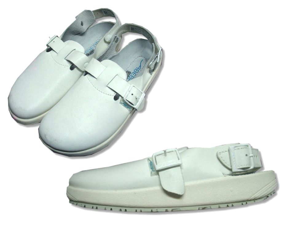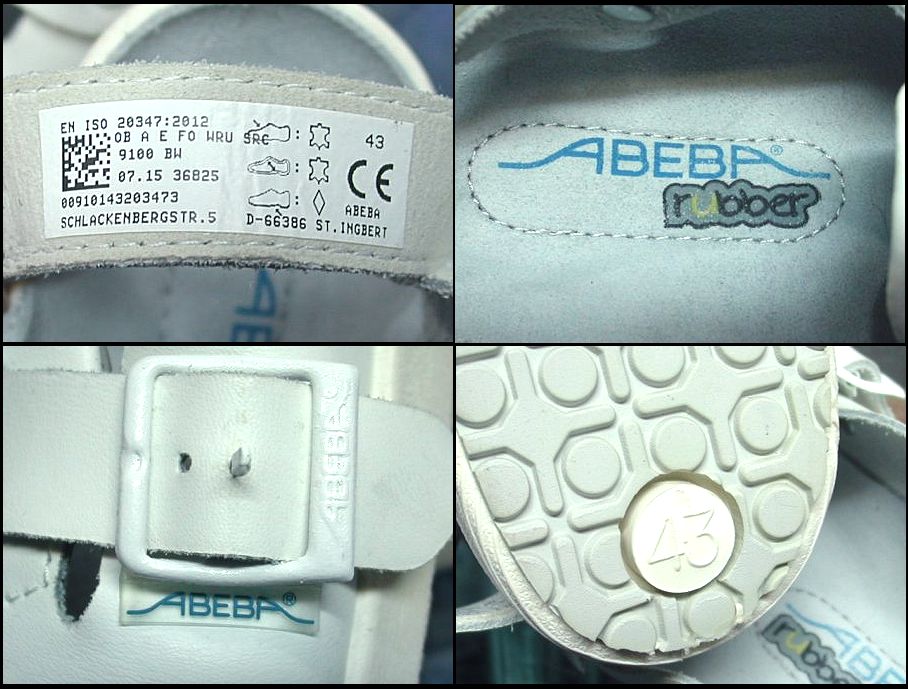 ABEBA rubber レザー メディカルサンダルです。アッパーはホワイトレザー。クロッグ型でヒールストラップも付いています。着用感はありますが、特に目立ったダメージはありません。