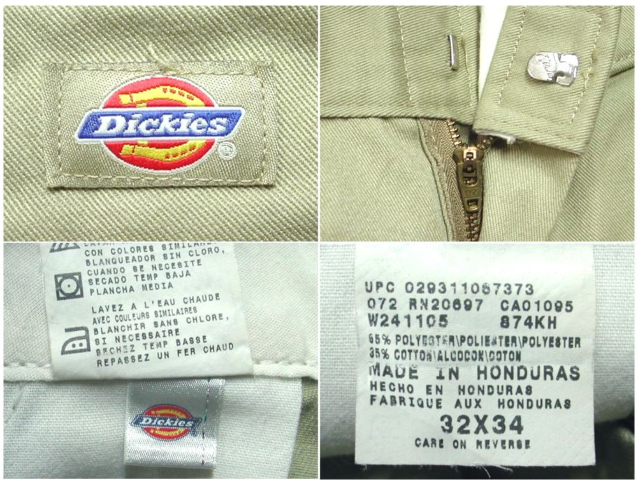 ディッキーズ 874 ワークパンツです。カラーはベージュで素材はポリエステル65% コットン35%になります。着用感はありますが、特に目立ったダメージはありません。