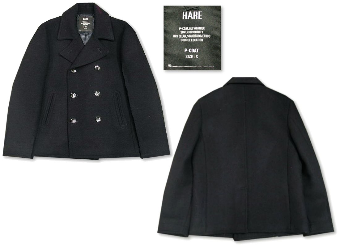 HARE Pコートです。カラーは濃紺で素材はウール65% レーヨン35%になります。着用感はありますが、特に目立ったダメージはありません。