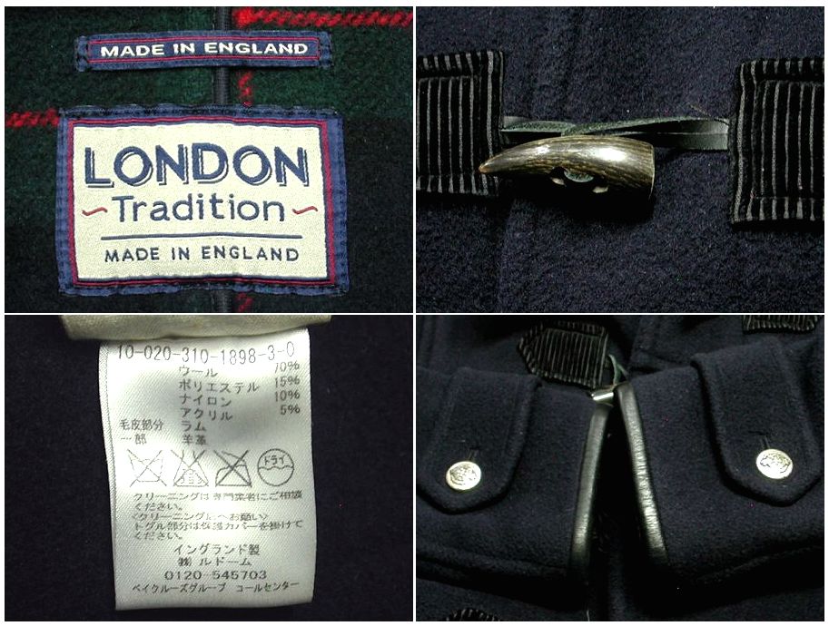 ロンドン トラディション ダッフルコートです。MADE IN ENGLAND カラーは濃紺で素材はウール100%になります。袖口はレザー仕様になります。フードは着脱可能です。着用感はありますが、特に目立ったダメージはありません。