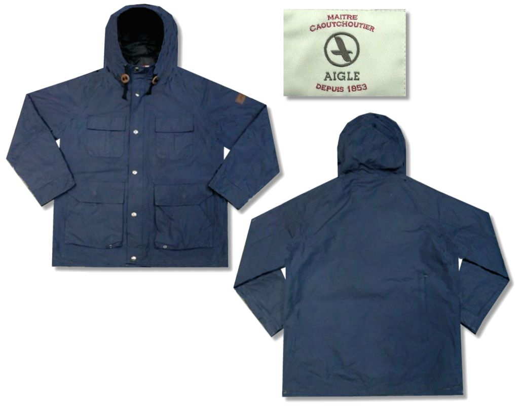 エーグル マウンテンパーカーです。カラーはネイビーで素材はナイロン100%になります。着用感はありますが、特に目立ったダメージはありません。