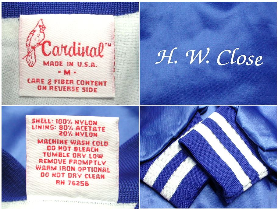 1990年代製 Cardinal ナイロンスタジャンです。MADE IN USA カラーはブルーで素材はナイロン100%になります。着用感はありますが、特に目立ったダメージはありません。
