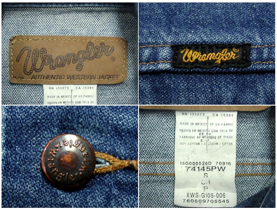1990年代製 Wrangler 74145PW デニムジャケットです。MADE IN MEXICO 状態は良好で特に目立ったダメージはありません。サイズ表記はSですが、普段Mサイズを着用している方に丁度いいサイズ感です。