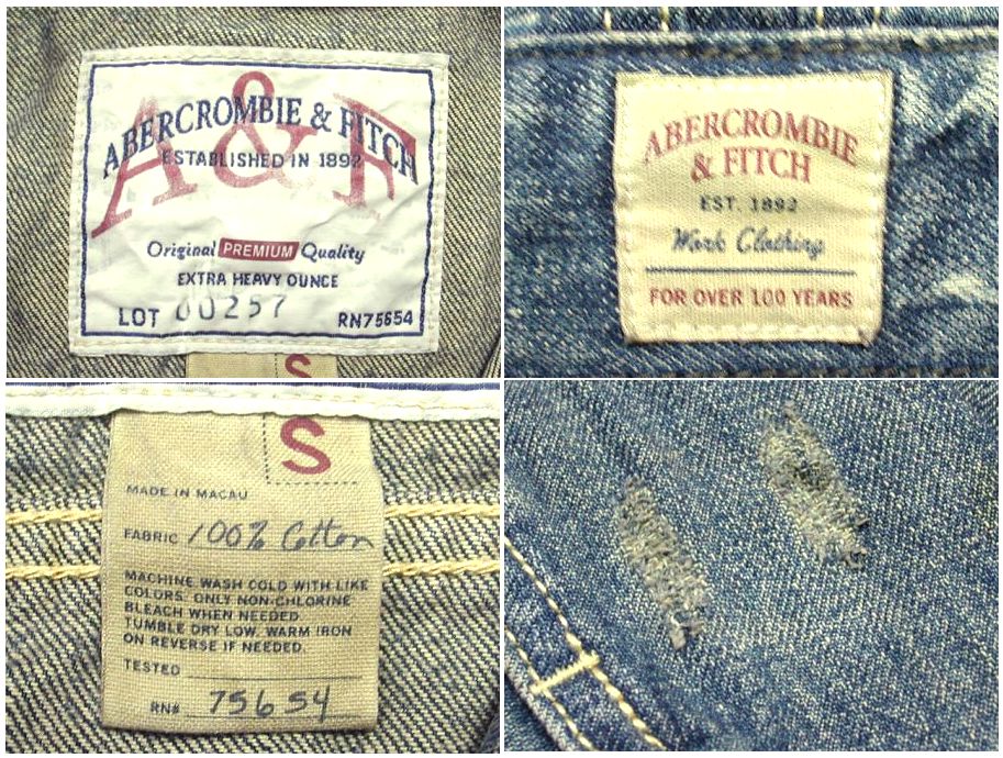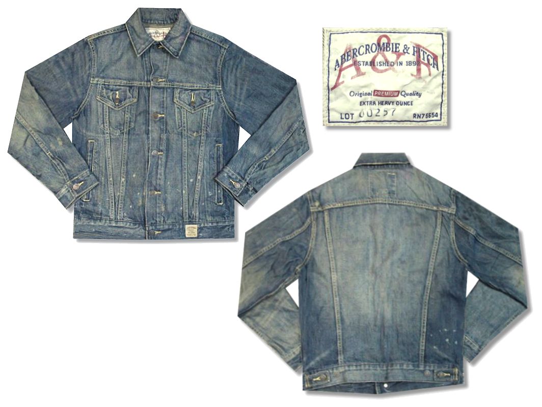 アバクロンビー&フィッチ USED加工 デニムジャケットです。着用感はありますが、特に目立ったダメージはありません。サイズ表記はSですが、普段Mサイズを着用している方に丁度いいサイズ感です。