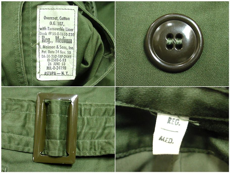 VINTAGE 1950年代製 US ARMY オーバーコートです。MIL-O-2419B 素材はコットンサテン地 裏地はありません。状態は良好で特に目立ったダメージはありません。