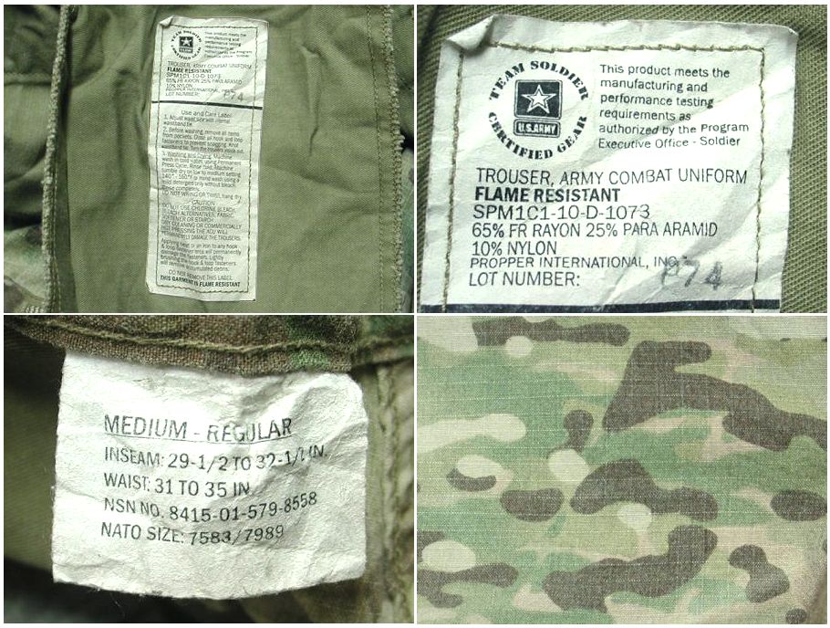 2010年製 US ARMY マルチカム フィールドパンツです。SPM1C1-10-D-1073 素材はレーヨン65% アラミド25% ナイロン10%になります。着用感はありますが、特に目立ったダメージはありません。