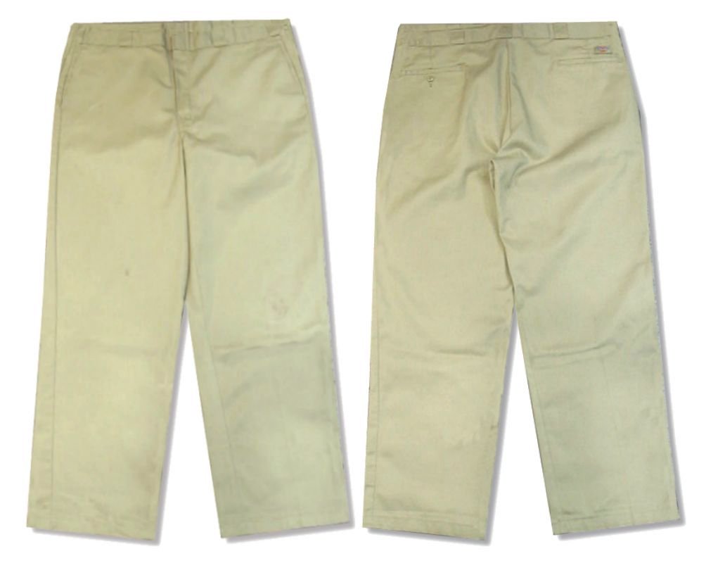 ディッキーズ ワークパンツです。カラーはベージュで素材はコットン35% ポリエステル65%になります。着用感はありますが、特に目立ったダメージはありません。