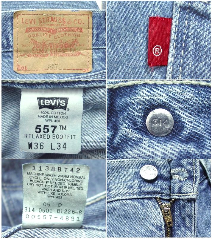 2001年製 Levi's 557 リラックスブーツフィット ジーンズです。MADE IN MEXICO 太めのブーツカットモデルです。トップボタン裏の数字は314 着用感はありますが、特に目立ったダメージはありません。