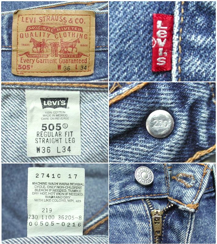2000年製 Levi's 505 ジーンズです。MADE IN MEXICO トップボタン裏の数字は230 着用感はありますが、特に目立ったダメージはありません。