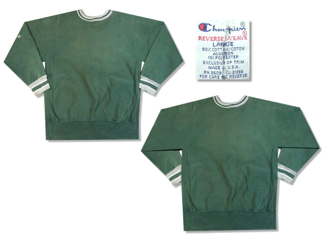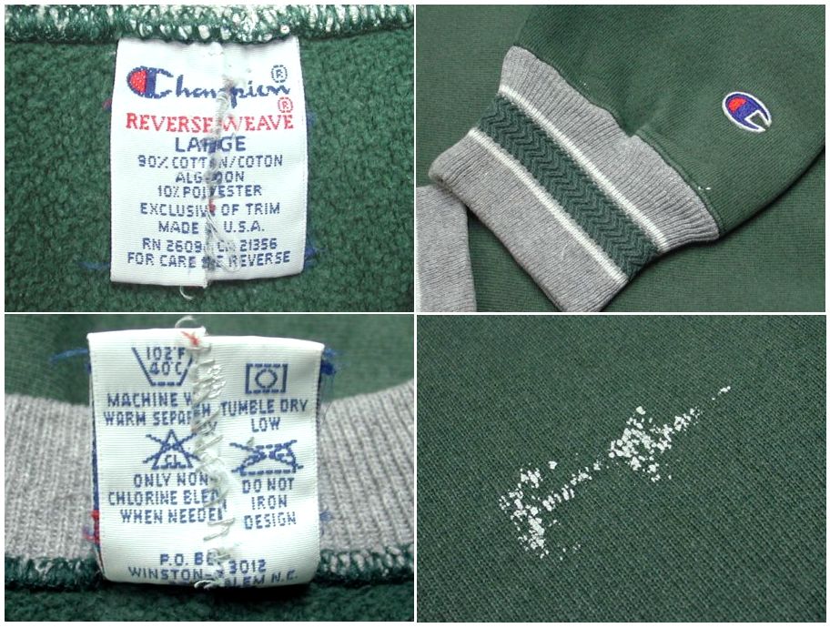 1990年代製 チャンピオン リバースウィーブ スウェットです。MADE IN USA カラーは深緑で素材はコットン90% ポリエステル10%になります。若干袖にペンキが付いておりますが、特に目立ったダメージはありません。