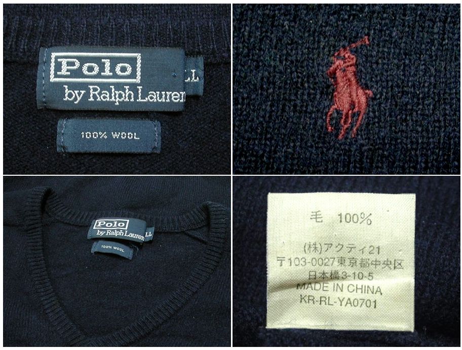 ラルフローレン Vネックセーターです。カラーはネイビーで素材はウール100%になります。着用感はありますが、特に目立ったダメージはありません。