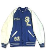 1990年代製 TM ATHLETICS スタジャンです。MADE IN USA 青のメルトンウールに白の革袖になります。着用感はありますが、特に目立ったダメージはありません。