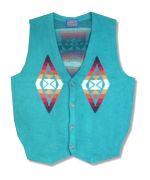 ペンドルトン ネイティブ柄 ベストです。カラーはターコイズブルーで素材はコットン100%になります。着用感はありますが、特に目立ったダメージはありません。サイズ表記はMですが、普段Sサイズを着用している方に丁度いいサイズ感です。
