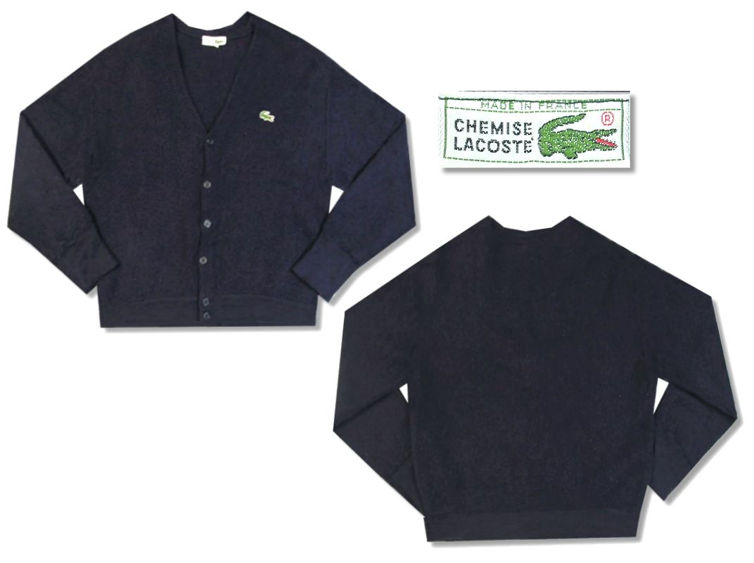 1970年代製 フレンチラコステ カーディガンです。MADE IN FRANCE カラーはネイビーで素材はアクリル100%になります。着用感はありますが、特に目立ったダメージはありません。