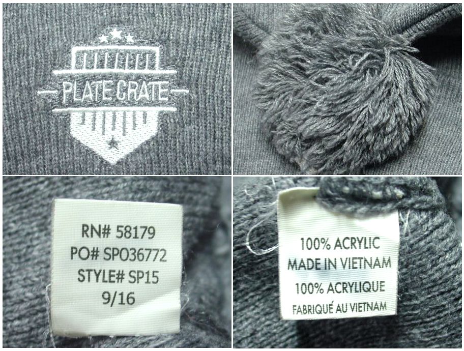 ニットキャップです。素材はアクリル100%になります。着用感はありますが、特に目立ったダメージはありません。