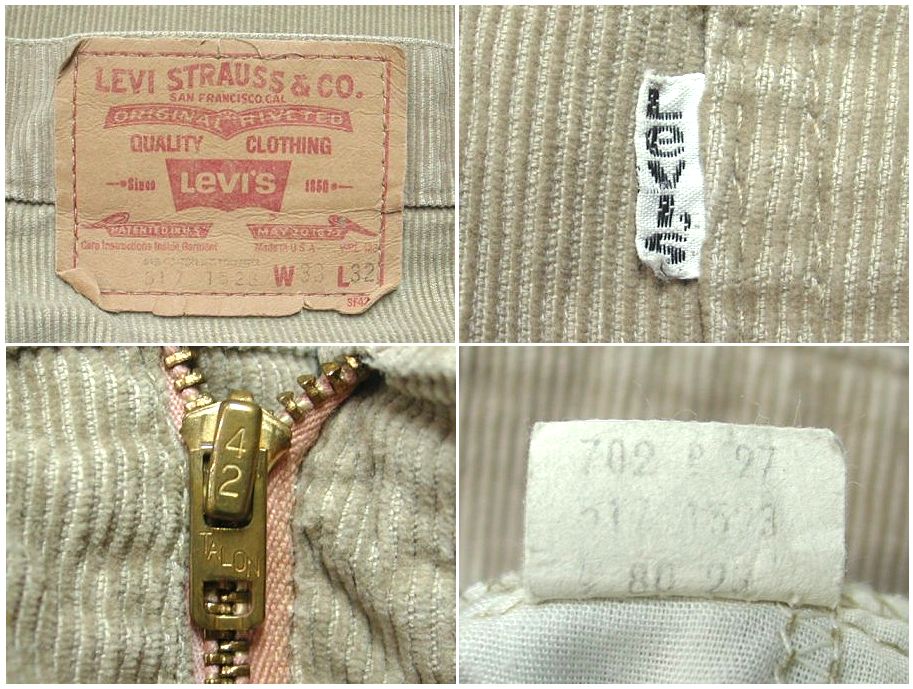 1980年代製 Levi's 517 ブーツカット コーデュロイパンツです。MADE IN USA カラーはベージュでジッパーはTALON42製になります。着用感はありますが、特に目立ったダメージはありません。