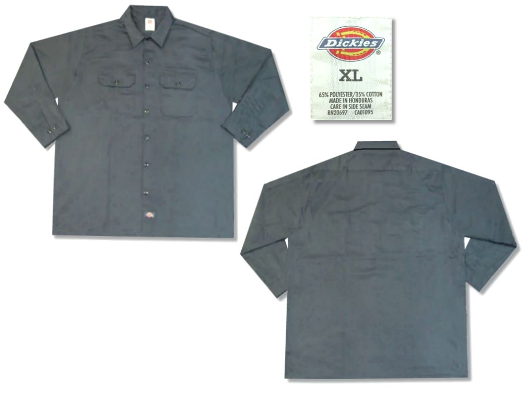 ディッキーズ ワークシャツです。カラーはグレーで素材はコットン35% ポリエステル65%になります。着用感はありますが、特に目立ったダメージはありません。