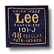 101 RIVET リベットは、フロントポケットのみに用いられる。カパー製で"LEE"のロゴ入り。これは、半世紀の間ほとんど変わっていない。例外は大戦中、1940年代の初めから中頃にかけて。スチール製の無刻印タイプや、ロゴ入りながらも形状がUFOに似たタイブがその時に採用されている。 |